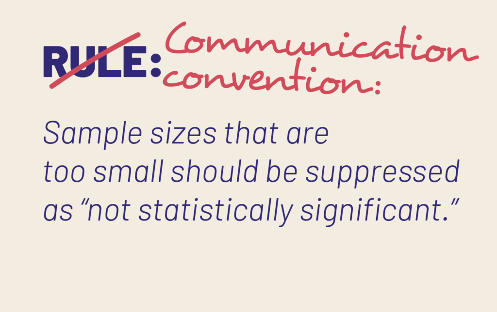 Saying “not statistically significant” because of an arbitrary rule of thumb with no mathematical basis oppresses the smallest groups within your sample, throws away useful data, doesn’t allow your audience to engage with the various levels of certainty in your work and pushes the responsibility of creating meaningful results off of you, the data producer, and onto minority sub-populations simply because they are smaller or more expensive for you to sample.