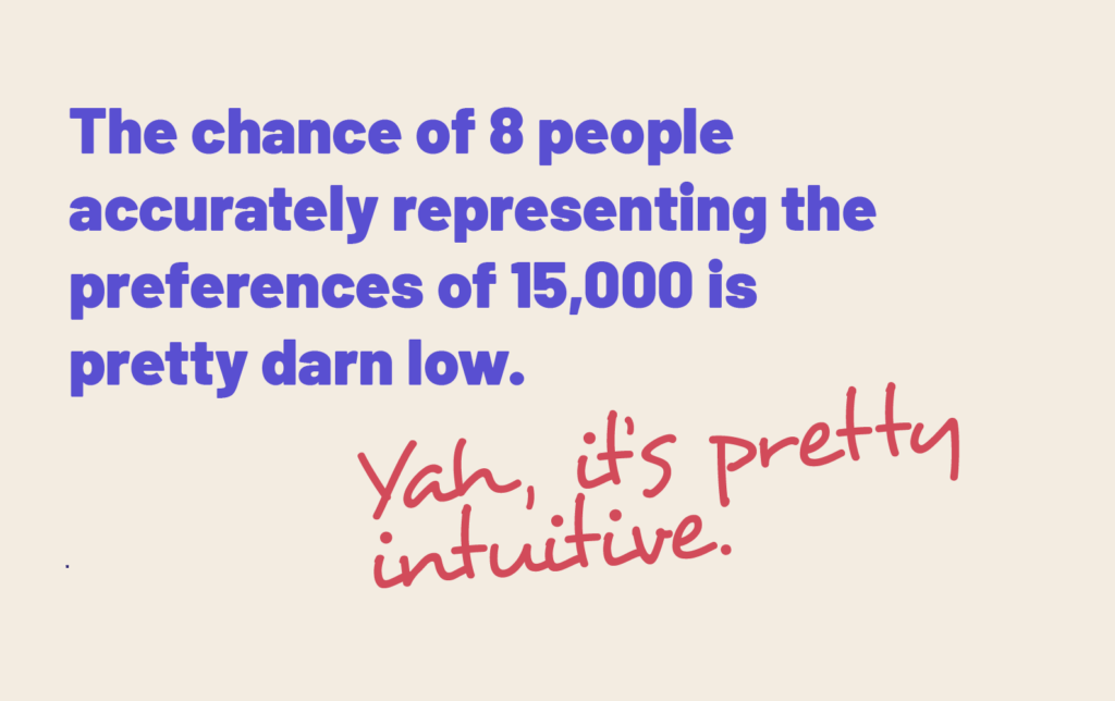 Let’s imagine that your town is made up of white, Black, Latinx, and Indigenous sub-populations. If you break out your results into these categories, and you have very few Indigenous respondents, you might be trained to say that their results are “not statistically significant”. But what you really mean is, “we have so few Indigenous respondents that we have a very high degree of uncertainty, and we don’t want you to even see the results in case you don’t understand just how uncertain we are about them!”