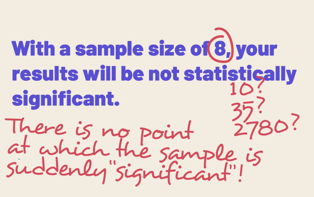 The term “not statistically significant” should only be applied to a hypothesis, not a sample size, and even then it’s an arbitrary line we’ve drawn to lump results into a false dichotomy of “certain” or “uncertain”, instead of talking about what level of uncertainty we are actually dealing with.
